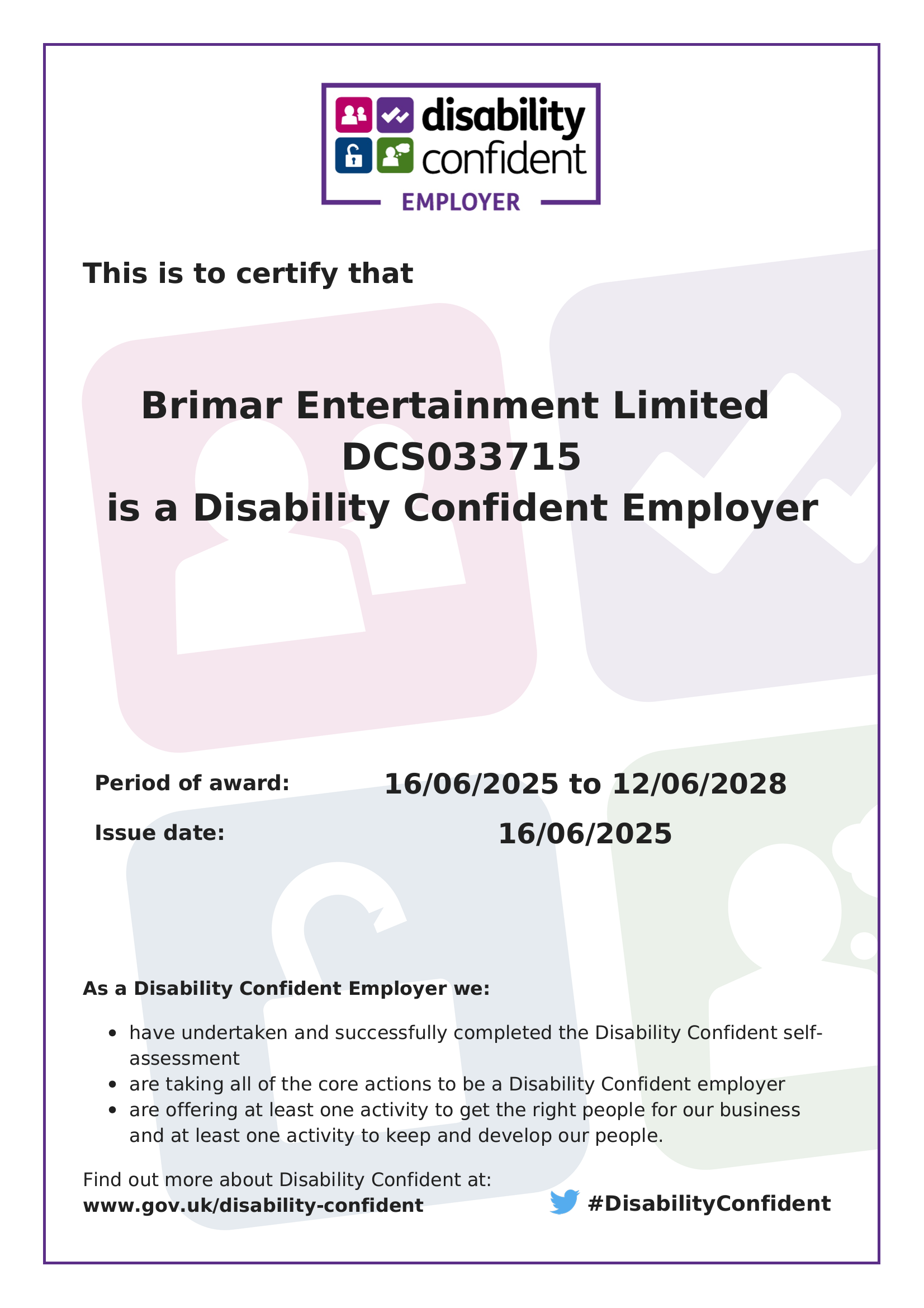 Brimar Entertainment Limited is certified by the British Government as being a Disability Confident Employer. We are listed on the government's Disability Confident members list and our commitment to upholding our certification is outlined within our Equality, Diversity and Inclusion Policy.